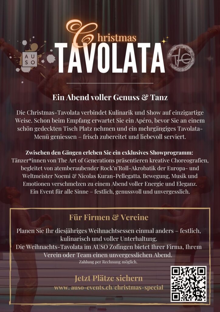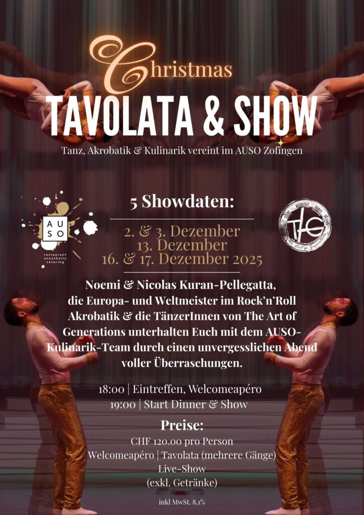 Die Weihnachts-Tavolata verbindet Kulinarik und Show auf einzigartige Weise. Schon beim Empfang erwartet Sie ein festlicher Apéro, bevor Sie an einem schön gedeckten Tisch Platz nehmen und ein mehrgängiges Tavolata-Menü geniessen – frisch zubereitet und liebevoll serviert. Zwischen den Gängen erleben Sie ein exklusives Showprogramm: Tänzer*innen von The Art of Generations präsentieren kreative Choreografien, begleitet von atemberaubender Rock’n’Roll-Akrobatik der Europa- und Weltmeister Noemi & Nicolas Kuran-Pellegatta. Bewegung, Musik und Emotionen verschmelzen zu einem Abend voller Energie und Eleganz. Ein Event für alle Sinne – festlich, genussvoll und unvergesslich.